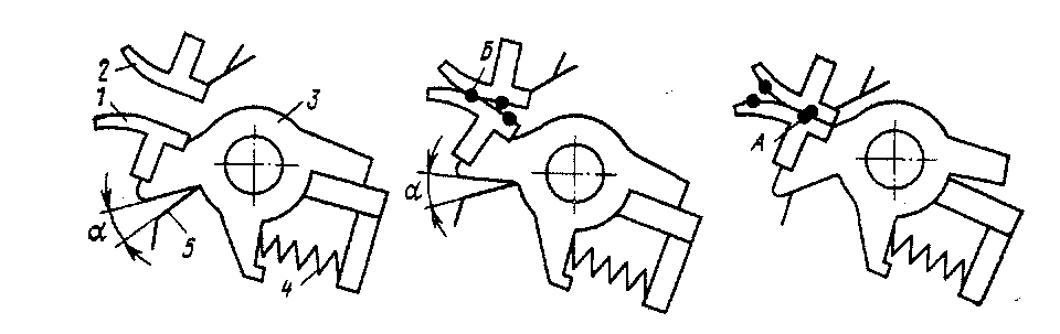 / — подвижной контакт; 2 — неподвижный контакт; 3 — держатель; -/ — притирающая пружина; 5 — рычаг; а — угол поворота подвижного контакта; А, Б — точки соприкосновения контактов