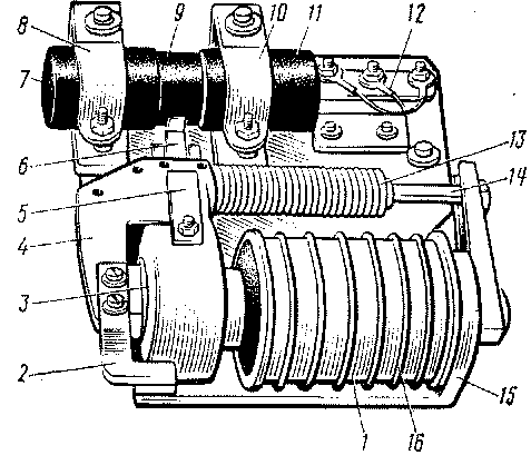 Регулятор СРН-8А служит для стабилизации напряжения генератора управления. Регулятор напряжения вибрационного типа с угольными контактами имеет литой магнитопровод 15 (рис. 115), на сердечнике которого установлена неподвижная катушка 1, поверх которой имеется еще катушка 16, имеющая 13 витков и включенная в цепь заряда батареи.