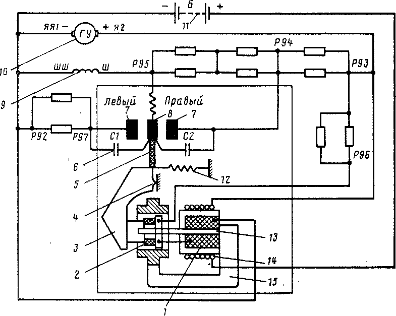 / — неподвижная катушка; 2 — подвижная катушка; 3 — коромысло; 4 — призматический упор; 5 - биметаллическая пластина; 6 - конденсаторы; 7 - неподвижные контакты; 8- подвижной контакт- 9 — обмотка возбуждения генератора; 10 — генератор управления; 11 батарея; и — пружина; 13 — сердечник; 14 — наружная неподвижная катушка; 15 — магиитопровод