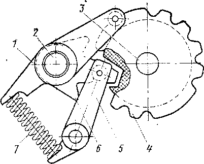 В нулевом положении главного и реверсивного валов, как показано на рис. 123, ролик фиксатора входит в среднюю впадину храповика 6, который жестко установлен на реверсивном валу 2. Одновременно конец фиксатора 1 входит во впадину колеса 4, которое жестко установлено на главном валу 3, этим самым вал запирается в нулевом положении. При повороте реверсивной рукоятки в одно из рабочих положений вместе с реверсивным валом повернется храповик 6 и ролик фиксатора 5 выйдет из средней впадины храповика, но под действием пружины 7 войдет в более глубокую впадину. Одновременно конец фиксатора выйдет из впадин колеса главного вала, что позволит его поворачивать в нужном направлении. Чтобы перевести реверсивную рукоятку из рабочего положения в нулевое, надо главную рукоятку установить в нулевое положение.
