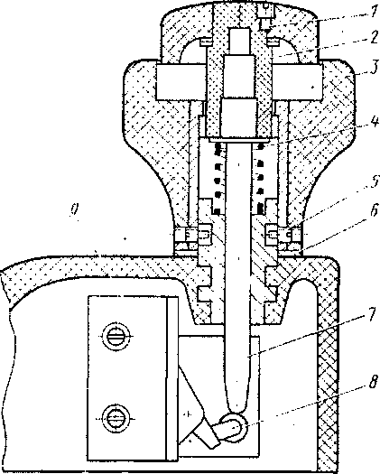 кнопку 2, прикрепленную винтом / (рис. 124), кнопка, перемещаясь вниз, пре: одолевает усилие пружины 4, перемещает ось 7, которая своим концом давит на ролик 8 микропереключателя 9 и замыкает цепь блокировки безопасности. Максимальный ход кнопки — до соприкосновения с площадкой головки 3 рукоятки. При прекращении нажатия на кнопку пружина возвращает механизм в исходное положение — цепь блокировки безопасности разомкнётся. Если машинист отпустит кнопку во время движения поезда, то сработает автостоп и обесточатся катушки линейных или тормозных контакторов.