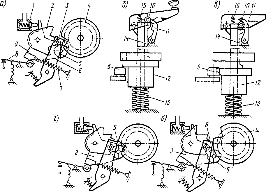 а — кинематическая схема; б, в и г, д — соответственно схемы механизма и кинематические схемы при нулевом и рабочем положениях главной рукоятки; / — пневматический клапан безопасности-2 — храповик реверсивного вала; 3 — ролик прямоугольного рычага; 4 — храповик главного вала'; 5 —ролик фигурного рычага; « — прямоугольный рычаг; 7 — пружина; 8 — контактор безопасности; 9 — фигурный рычаг; 10 — стержень; // — защелка; 12 — кулачок; « — главная пружина-14 — шпонка; 15 — пружина главной рукоятки