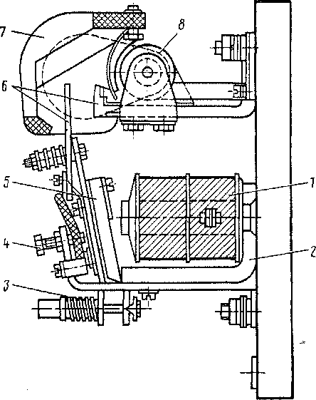Контактор КМ-ЗЕ состоит из включающей катушки / (рис. 126) с сердечником, магнитопровода 2 Г-образной формы и якоря 5. На якоре смонтированы главный подвижной контакт 6 и подвижные блок-контакты. Последние установлены на изоляционной прессованной планке, которая укреплена винтом 4 на хвостовике якоря. Контактор имеет один или два замыкающих и столько же размыкающих контактов. Главный неподвижный контакт соединен с концом ду-гогасительной катушки 8. К сердечнику катушки присоединены стальные полюсы
