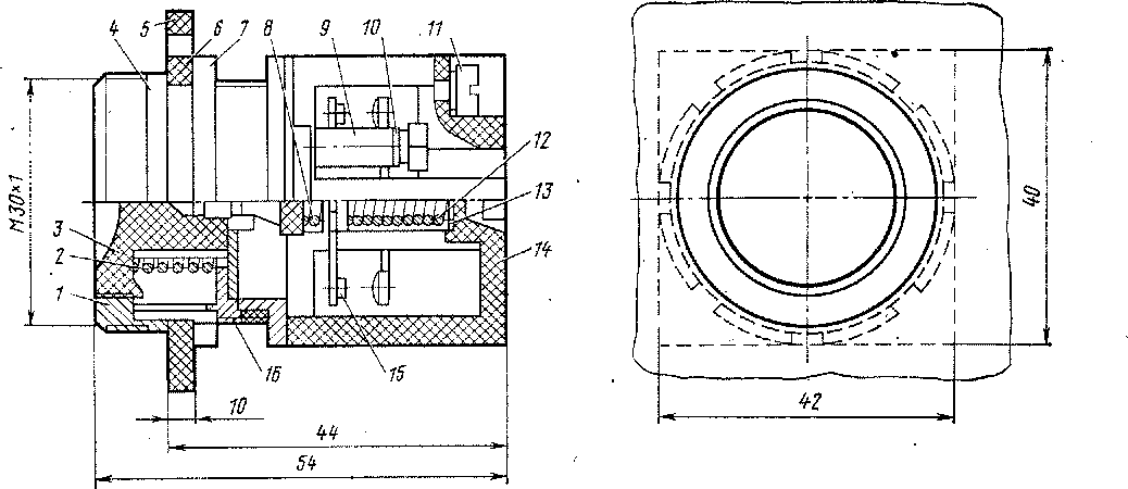 / — фланец; 2 — возвратная пружина; 3 — толкатель; 4 — фронтальное кольцо; 5 — панель; 6 — ориентирующее кольцо; 7 —гайка; 8, 12 — пружины; « — неподвижные контакты; 10 — скобы; 11 — вннты; 13 — траверсы; 14 — пластмассовый корпус; 15 — контакты мостикового типа; 16 — нажимная шайба