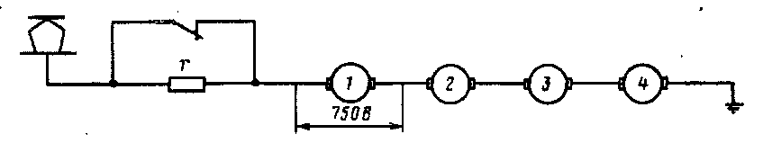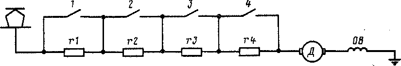 На электропоездах уменьшение сопротивления пусковых резисторов производят ступенчато. Для этого пусковые резисторы разбивают на несколько секций (г1 —г4), которые постепенно замыкают накоротко посредством контакторов 1—4.