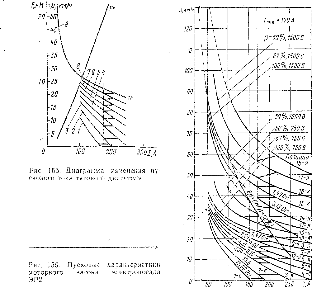 Зависимость скорости поезда от тока двигателя при полностью выведенных пусковых резисторах называют скоростной естественной характеристикой. Она показывает, что при малых токах скорость поезда резко возрастает и снижается при увеличении тока (кривая 9 на рис. 155). Эту естественную характеристику двигателя иначе называют автоматической, так как при работе по ней двигатель автоматически изменяет развиваемый им вращающий момент и частоту вращения в зависимости от тока обмотки якоря. При включении последовательно с двигателем пусковых резисторов получают ряд так называемых реостатных характеристик, которые располагаются ниже естественной (безреостатной) характеристики. Каждой ступени пускового сопротивления соответствует своя кривая, причем чем больше сопротивление, тем ниже эта кривая располагается. Для любого произвольного значения тока /, по приведенным характеристикам можно определить скорость поезда на каждой ступени реостатного пуска.