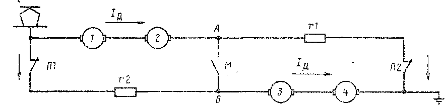 В практических условиях сопротивления цепей тяговых двигателей и пусковых резисторов неодинаковы, потому через контактор М может протекать уравнительный ток в ту или иную сторону. Ток может проходить по двум цепям: через двигатели /, 2, контактор М (/„), двигатели 3, 4 и далее «земля» и через контактор 171, резистор т2, контактор М, в обратном направлении (/г), резистор г1, контактор 172 и далее «земля». Таким образом, при неодинаковых сопротивлениях этих цепей может протекать уравнительный ток /ур = /д — /г; при /д = 1Т ток />р = 0.