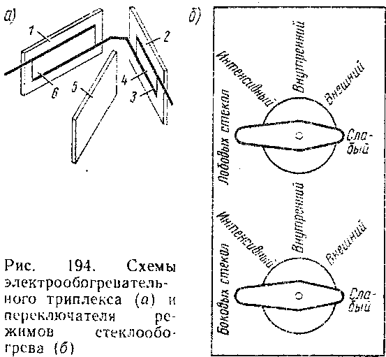 нагревательных элементов панелей обеспечиваются четыре режима нагрева. Переключатели режимов стеклообогрева расположены на одном блоке с выключателем стеклообогрева окон и имеют четыре положения рукоятки (рис. 194, б). В положении рукоятки переключателя Слабый оба нагревательных элемента (на внутренней и внешней пластинах) включены последовательно. Этот режим используют при сравнительно невысоких отрицательных температурах, для предотвращения запотевания, В положении рукоятки Внешний включен нагревательный эле-
