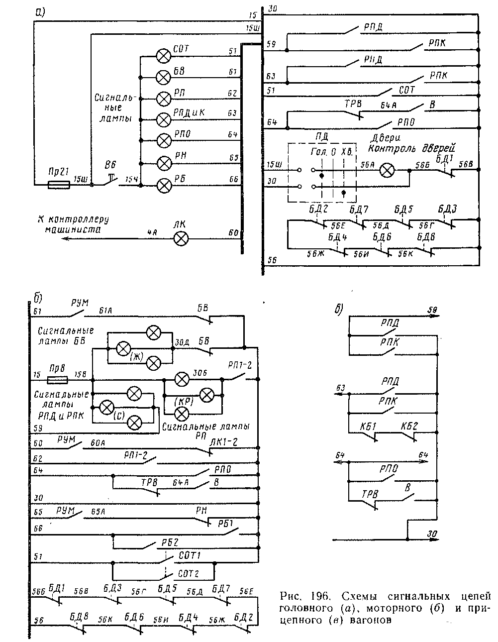 На сигнальные лампы головного вагона (рис. 196, а) напряжение («плюс») подается по проводу 15 через выключатель В6 (сигнальные лампы), а «минус» — по поездному проводу к каждой лампе отдельно через контакты тех аппаратов, о положении которых сигнализирует данная лампа. В головной вагон подаются следующие сигналы: о срабатывании БВ, РП, исчезновении напряжения сети (опустился токоприемник, сгорел предохранитель вспомогательных цепей), о возникновении боксования, срабатывании реле перегрузки преобразователя или компрессора РПД и К, неисправности в цепях отопления РПО, неисправности генератора управления (контакты КБ1 и К Б 2), о сборе силовой цепи и включении контакторов ЛК- Цепи питания каждой лампы прослеживаются по схеме.