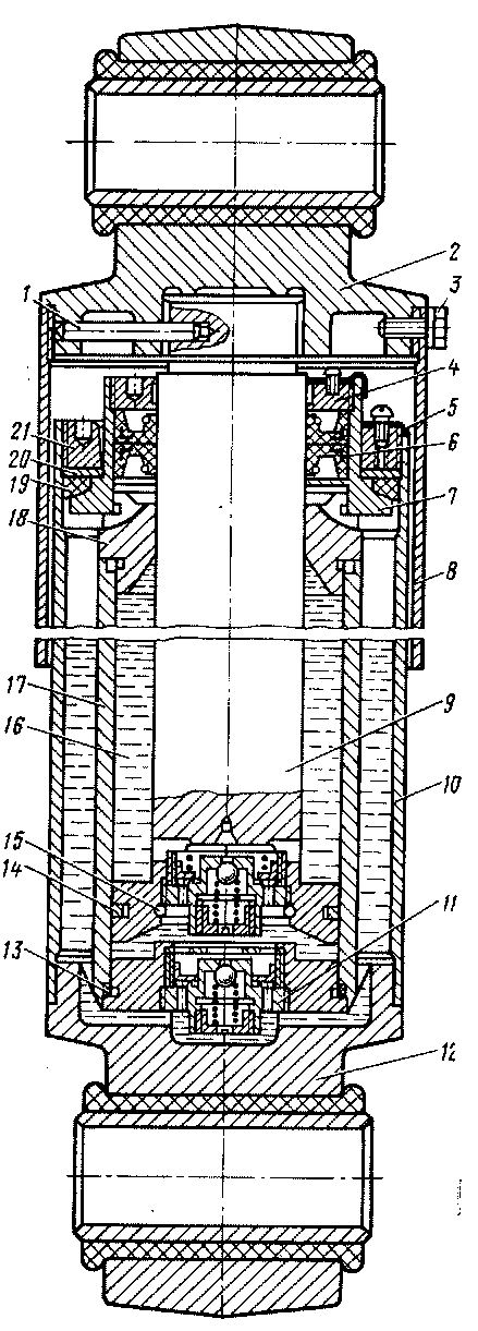 Рис. 28. Гидравлический гаситель: / ■- штифт; 2 — верхняя головка; 3 — стопорный винт; 4 — гайка сальника; 5 — стопорная планка; 6 — сальник; 7 — корпус сальника; 8 — защитный кожух; 9 — шток; 10 — запасный резервуар; //— нижний клапан; 12 — нижняя головка; 13 — резиновое кольцо; 14 — поршневое кольцо; 15 — стопорное кольцо; 16 — приборное масло; 17 — рабочий цилиндр: 18 — головка рабочего цилиндра; 19 — резиновое кольцо: 20 металлическое кольцо; 21 -гайка
