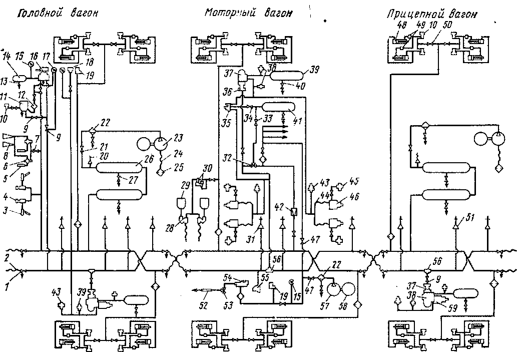 / - концевой кран; 2, 24, 44 — соединительные рукава; 3 — стеклоочиститель; 4, 27 — краиы; 5 — свисток; 6- клапан звуковых сигналов; 7, 9, 33, 34, 50 — разобщительные краны; 8 — тифои; 10 — включающий вентиль; //—клапан автостопа; 12, 25 — фильтры; 13 — пробка; 14 — уравнительный резервуар; 15, 17 — манометры; 16 — кран машиниста; 18, 19 — регуляторы давления; 20 — предохранительный' кран; 21, 47 — обратные клапаны; 22 — маслоотделитель; 23 — электрокомпрессоры; 26' —главным резервуар; 28— форсунки; 29 — бункера для хранения песка; 30 — клапан форсунки электропиевматическ'ий; 31, 51 — стоп-краны; 32, 53 — трехходовые краны; 35 — реле давления; 36 — воздухораспределитель; 37 — электровоздухораспределитель; 38 — выпускной одинарный клапан; 39 —запасный резервуар; « — рукав токоприемника; 41 — питающий резервуар; «—редуктор; 43 — сигнализатор отпуска тормоза; 45 — регулятор выхода штока; 46, 59 —тормозные цилиндры; 48 — дверные цилиндры; 49 — регулировочные вентили; 52 — изолятор; 54 — клапан токоприемника; 55 — выключатель управления; 56" —тройник; 57 — вспомогательный компрессор; 58 — электродвигатель вспомогательного компрессора