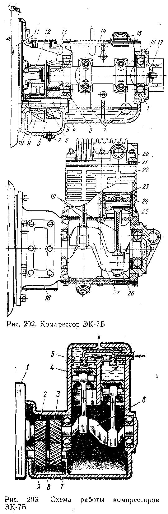 Работу компрессора можно проследить по схеме рис. 203. Шестерня 2 получает вращение от двигателя и через блок шестерней 7 и с? передает вращающий момент на эксцентриковую ось 9, которая приводит в движение шестерню 3, сидящую на коленчатом валу 6. При движении поршня 4 вниз происходит всасывание воздуха. В это время второй поршень движется кверху и происходит нагнетание воздуха. При обратном движении поршня 4 осуществляется нагнетание воздуха в полость крышки 5 и далее в главный резервуар. За один оборот коленчатого вала 6 в цилиндрах попеременно совершаются процессы всасывания и нагнетания.