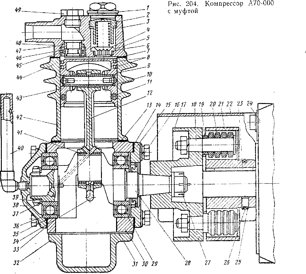Нагнетательный клапан 4 к своему седлу прижимается пружиной 2, упирающейся вторым концом в пробку 1, а всасывающий клапан 46 прижимается пружиной 45. Над всасывающим клапаном в головку 3 ввернута пробка 49. Со стороны подшипника 29 картер через прокладку 14 закрыт крышкой 15, в крышке помещено уплотнение коленчатого вала. Со стороны подшипника 36 через прокладку 33 картер закрыт крышкой 38. В крышку через угольник ввернут сапун 40. На хвостовик коленчатого вала навернута упорная гайка 39, которая стопорится замковой шайбой 37. Подшипник имеет стопорное кольцо 35.