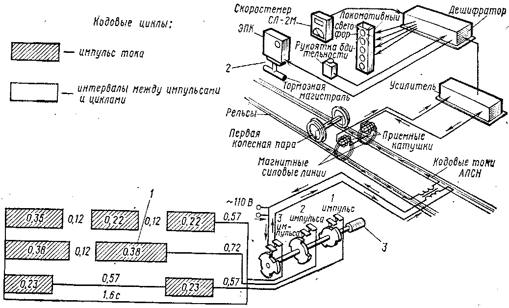 Для передачи сигналов путевых светофоров на локомотивный светофор используют рельсовые цепи. Трансмиттер через реле и кодовый трансформатор питает рельсовую цепь кодированным переменным током, посылая коды навстречу поезду. Каждое показание путевого светофора представляет собой определенную комбинацию импульсов, посылаемых в рельсовую цепь с различным интервалом. При зеленом огне путевого светофора посылается три импульса тока, за которыми следует длинный интервал, отделяющий их от импульсов следующего цикла. При желтом огне в рельсовую цепь поступают два импУльса с еще большим интервалом между циклами. При желтом с красным огне локомотивного светофора посылается один импульс. При красном огне локомотивного светофора по рельсовым цепям проходит непрерывно ток или вообще тока нет. Поступление непрерывных импульсов (без длинных интервалов, разграничивающих циклы) вызывает появление белого огня вместо зеленого или желтого, а также красного вместо желтого с красным. Ток, посылаемый навстречу поезду, проходит по одной рельсовой нити, замыкается через первую колесную пару и по второй рельсовой нити возвращается к источнику питания.