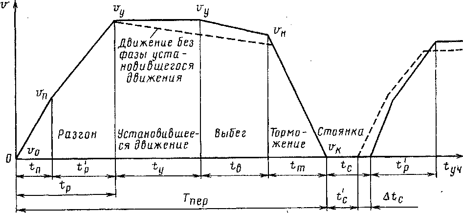 Сокращение времени стоянок приводит к уменьшению скорости движения на перегонах, а следовательно, к сокращению расхода электроэнергии. Время движения по участку гуч складывается из суммарного времени А2/пер движения по всем перегонам" и суммарного времени _гст, затраченного на стоянку поезда: гчу = 2гпер + 2гст.