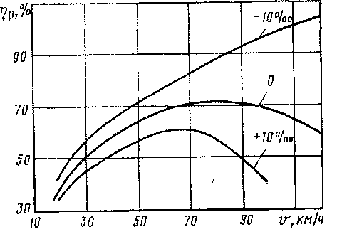 Процесс разгона поезда связан с запасом кинетической энергии, которую приобретает поезд, набирая скорость. По соотношению между энергией кинетической и энергией, взятой из контактной сети, можно определить коэффициент полезного действия разгона (рис. 236). Из кривой для движения на подъеме видно, что наибольший к. п. д. разгона достигается при скорости 65—70 км/ч. При разгоне выше указанных скоростей к. п. д. резко снижается. Скорость 65 км/ч — примерно среднее значение скорости на участках дорог пригородного движения. Этим можно еще раз объяснить выгодность, наиболее рациональный расход электроэнергии при установившемся движении на подъем. Такое же положение складывается при езде, на площадке, но наибольший к. п. д. разгона поезда на площадке Достигается при скорости 80 км/ч.