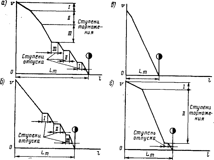 Скорость начала торможения зависит от режима разгона и продолжительности выбега. Выбор начала торможения и его интенсивность зависят от графика движения и квалификации машиниста. Часто машинисты полную остановку поезда осуществляют с применением ступенчатого торможения до определенной скорости с переходом на ступенчатый отпуск (рис. 237, а). Ступени торможения осуществляются различным нажатием на колодки, а следовательно, в процессе ступенчатого торможения несколько раз изменяется интенсивность торможения.