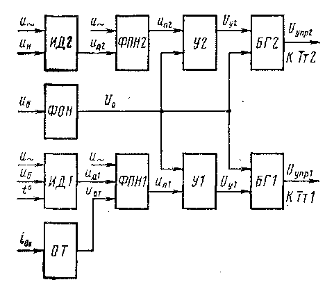В группе управления можно выделить следующие функциональные подгруппы: измерительный делитель напряжения (ИД), формирователь пилообразного напряжения (ФПН), формирователь опорного напряжения (ФОН), усилитель (У), блокинг-генератор (БГ) и ограничитель тока заряда аккумуляторной батареи (ОТ).