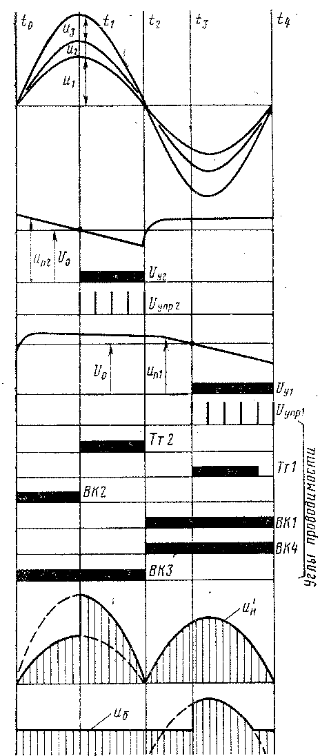 Ток нагрузки на интервале и—к замыкается по цепи через обмотку о»! трансформатора ТрР, вентили ВКЗ и ВК2. При этом выходное напряжение выпрямителя нн равно напряжению и± на обмотке о^. На интервале ^ — 4 проводят ток тиристор ТТ2 и вентиль ВКЗлн выходное напряжение ыи определяется суммой напряжений ии и2, и3 на обмотках хюг, хю%, гю3. На интервале /2 — к проводят ток вентили