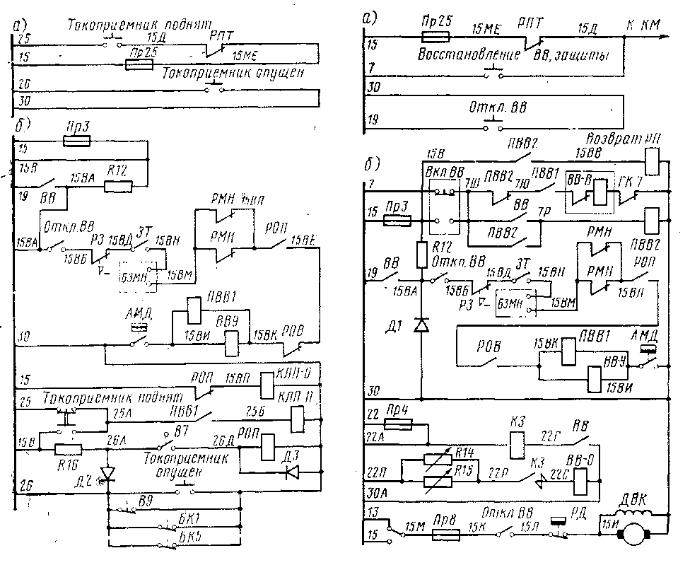 Токоприемник. При нажатии на кнопку. Токоприемник поднят в головном вагоне получает питание провод 25 (рис. 121,а), а на моторном вагоне катушка клапана токоприемника КЛП—Я питается по цепи через замыкающий контакт ПВВ1 промежуточного реле управления воздушным выключателем (рис. 121, б).
