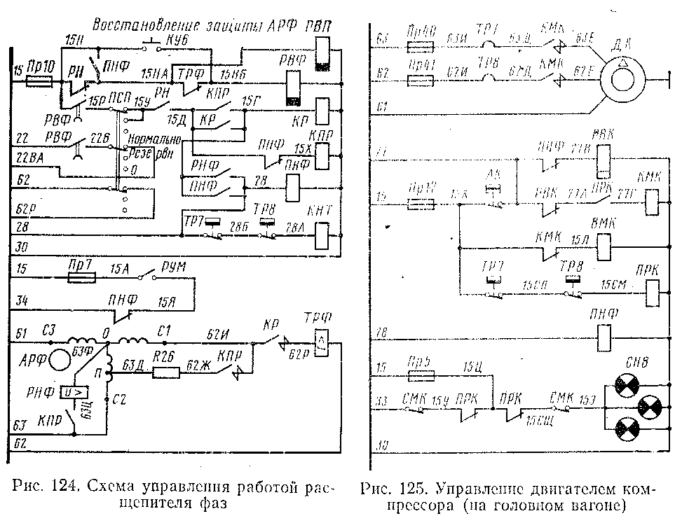Включение компрессоров производится контакторами двигателей компрессоров КМК только при работающем расщепителе фаз АРФ, так как при замкнутых контактах регулятора давления АК и неработающем расщепителе фаз срабатывает реле времени-'РБ/С, катушка которого получает питание через контакт повторителя реле напряжения фазорасщепителя ПИФ. Контакт РВК в цепи (27—21'А) размыкается, и катушка КМК питания получить не может.