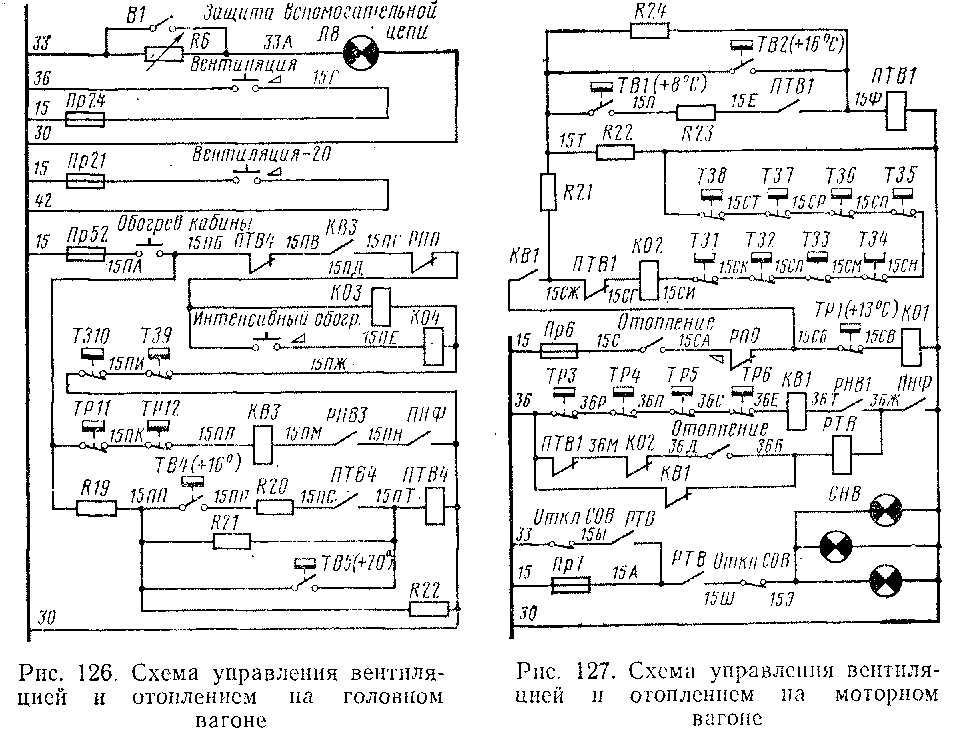 Аппаратура вентиляции и отопления. Вентиляция пассажирских помещений включается кнопкой Вентиляция на головном вагоне. При этом получает питание провод 36 (рис. 126). От этого провода, если работает расщепитель фаз и, следовательно, замкнут контакт реле-повторителя напряжения расщепителя фаз ПНФ(36)К — 30), на моторном вагоне (рис. 127), а также на головном и прицепном через контакты термореле двигателей вентиляторов ТРЗ, ТР4, ТР5, ТР6 (36—35Е) и контакт реле напряжения двигателей вентиляторов РНВ1 (36Т—36Ж) получает питание катушка контактора вентилятора КВ1- Контактор КВ1 своими главными контактами включает