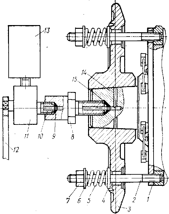 введите шпильки 2 через отверстия фланца 3 и заверните в освободившиеся резьбовые отверстия; наденьте на свободные концы шпилек 2 опорные шайбы 4, пружины 5, стопорные шайбы 6, наверните гайки 7;