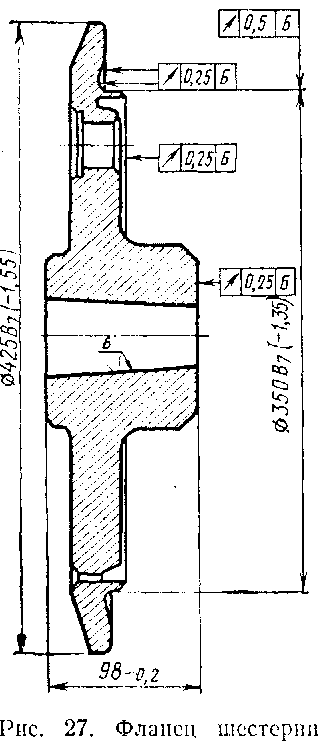 Не допускаются к установке фланцы двигателя и шестерни, имеющие трещины, радиальное и торцовое биение поверхностей, обозначенных на рис. 26 и 27, больше нормы. Восстановление или исправление фланцев сваркой не допускается. Втулки полуколец с прослабленной посадкой к установке не допускаются.