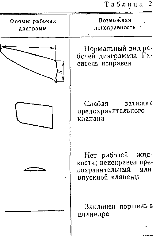 берите и замените негодпые-манжеты 11 или резиновое кольцо 19, долейте масло. Гаситель считается годным, если его диаграмма соответствует образцу (см. табл. 2) и значение механического сопротивления находится в пределах 9-10* .12-104 Н-с/м (90... 120 кгс-с/см) Неисправный гаситель |