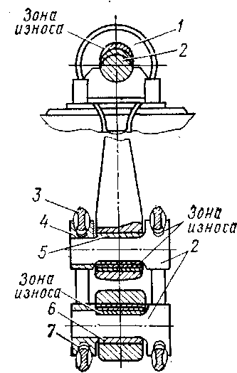 Недопустимы выкрашивание и смятие резьбы на гайках и тягах 16 (См. рис. 17), отслоение резины от армировки резино-металлических пакетов 18, трещины в ар-мировочных тарелях. На всех трущихся поверхностях деталей подвески центрального подвешивания (тягах, валиках, серьгах) выкрашивание и задиры основного металла недопустимы. Для деталей подвески допустим следующий износ: 3 мм для тяги 1 (рис. 29); 1 мм для валиков 2, втулки 5 тяги, втулки 6 поддона; 1,5 мм для серьги 3, верхней 4 и нижней 7 стопорных шайб. При большем износе детали замените новыми или восстановите в соответствии с Правилами деповского ремонта электропоездов и электросекций (ЦТ/2614).