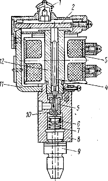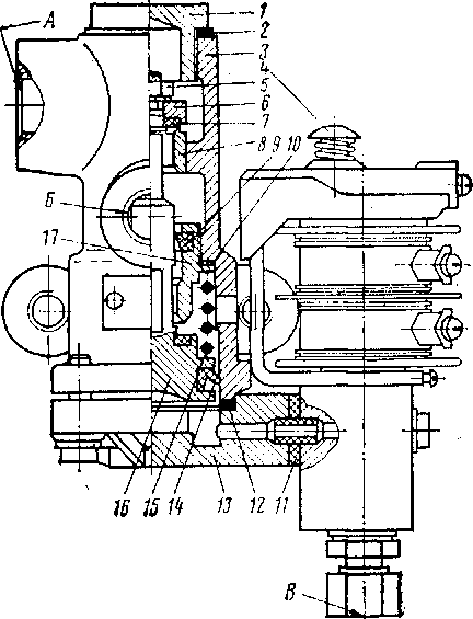Устройство и работа. Электропневматический клапан (рис. 35) состоит из корпуса 3 с запрессованной верхней втулкой 8 и ввернутой нижней втулкой 17. Втулка 17 с корпусом 3 уплотнена прокладкой 10. В корпусе находится поршень 16, уплотненный резиновой манжетой 14. На штоке поршня с помощью гайки 5 закреплен клапан, состоящий из диска 6 и резинового кольца 7.