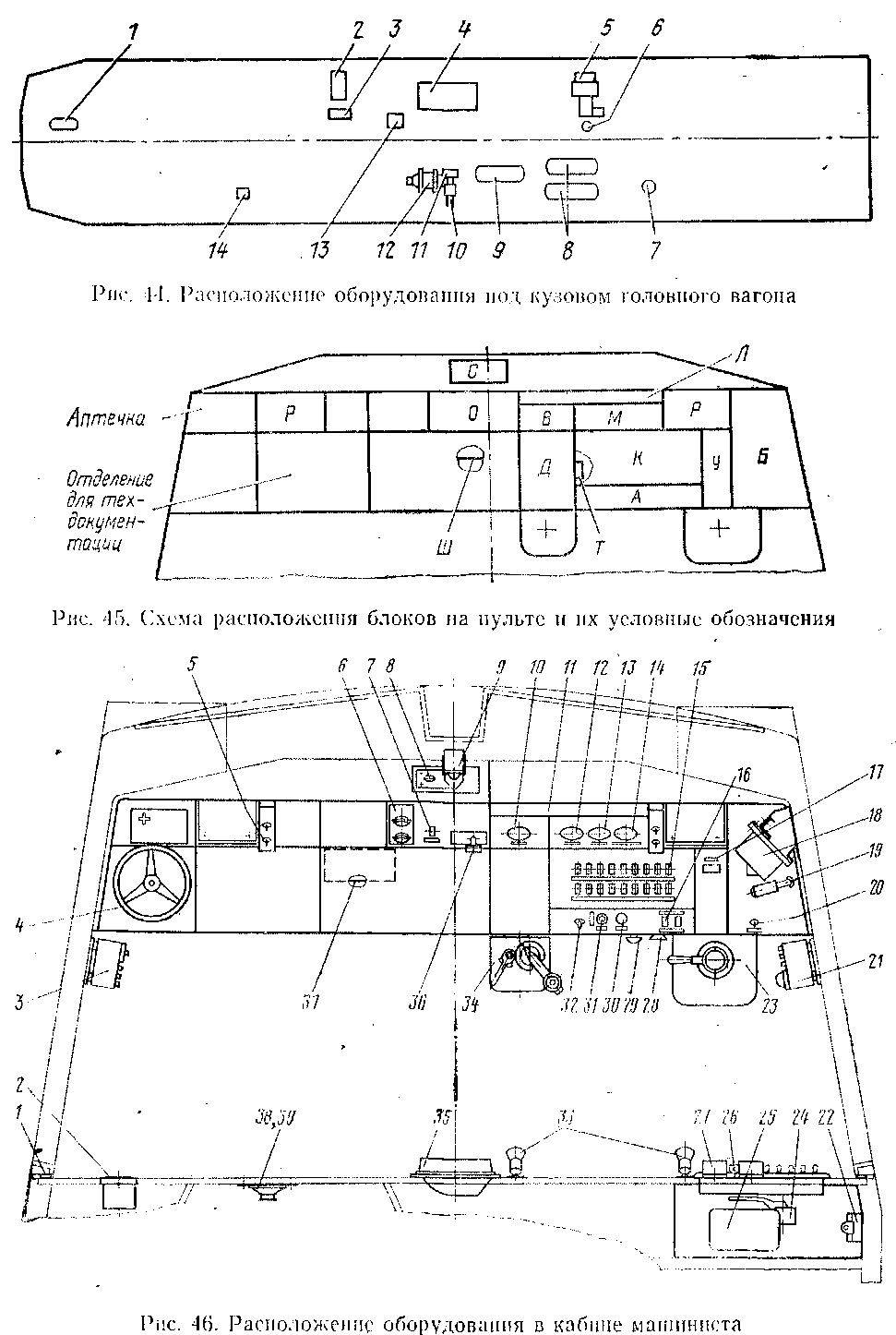 В кабине машиниста смонтирован пульт со всеми необходимыми аппаратами управления, наблюдения, сигнализации и радиосвязи. Часть аппаратуры размещена на задней стенке кабины. Пульт выполнен в виде отдельных съемных блоков, на каждом из которых аппараты скомпонованы в зависимости от их назначения (рис. 45).