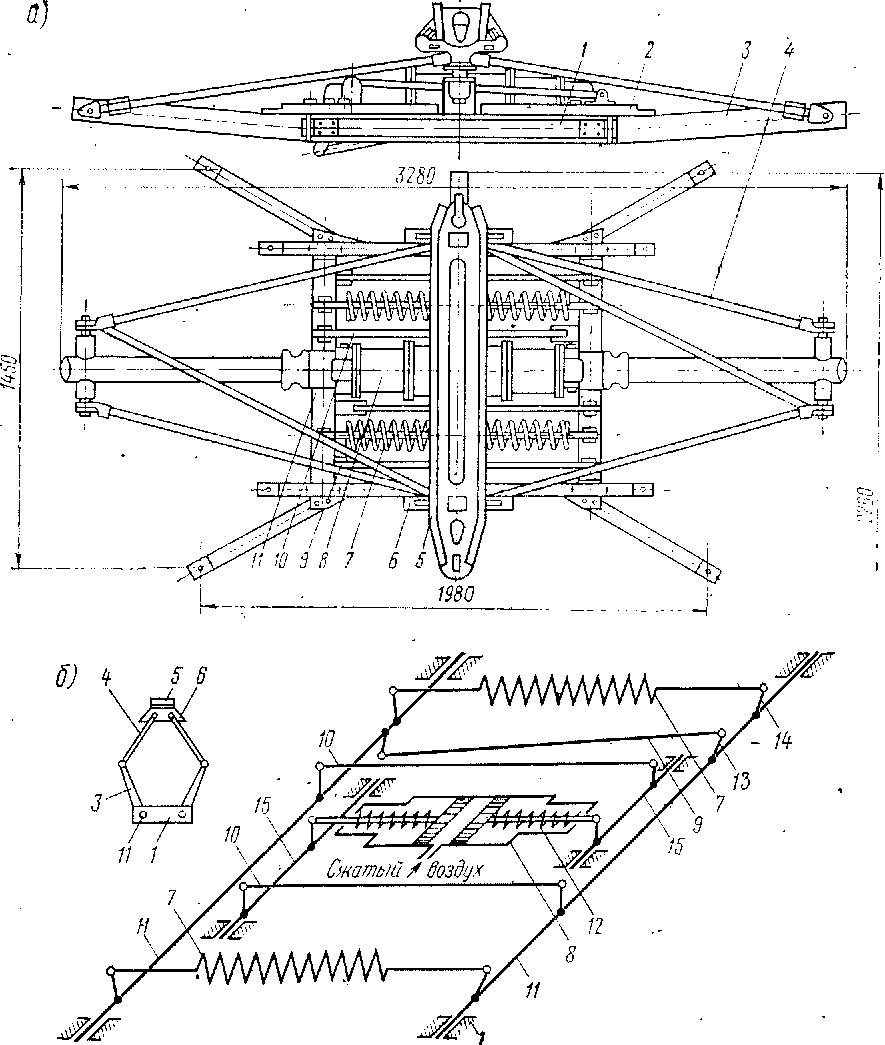 Кинематическая схема привода токоприемника приведена на рис. 53, б. При отсутствии сжатого воздуха в цилиндре 8 опускающие пружины 12, вмонтированные в цилиндры, стремятся сблизить поршни и через промежуточные валы 15 и тяги 10 создают вращающие моменты, приложенные к валам 11 и.действующие в направлении опускания токоприемника. Пружины 12 компенсируют действие пружин 7 и опускают подвижную систему токоприемника до упора. При подаче сжатого воздуха в цилиндр поршни расходятся, сжимая опускающие пружины.