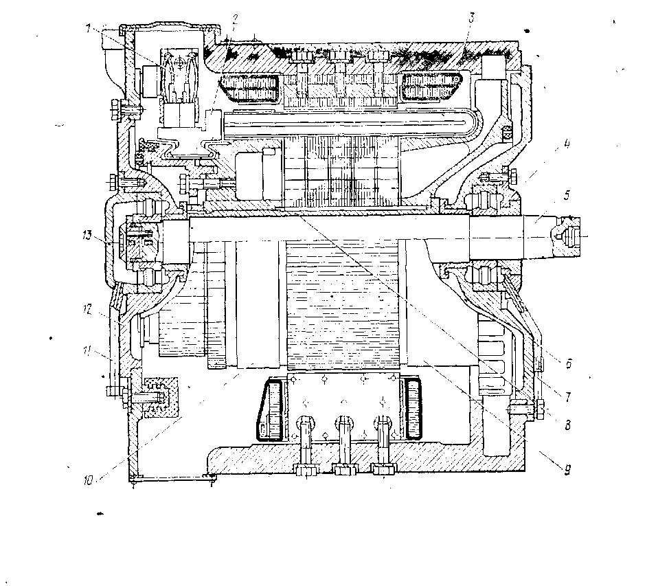 / — щеткодержатель; 2 — коллектор; 3 — станина; 4, 13 — крышки подшипников; 5 —вал;