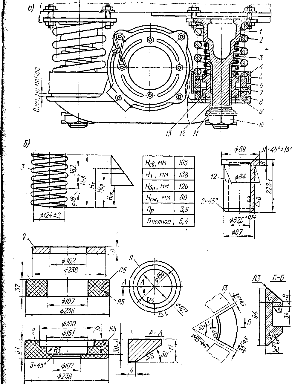 ■ / —шпинтон; 2, 3 — пружины; 4 — регулировочная прокладка; 5 — диск; 6, 8 — кольца резиновые; 7 — кольцо опорное; 9 — кольцо; 10 — гайка шпннтона; // — шайба пружинная; ? 12 — втулка; 13 — сухарь