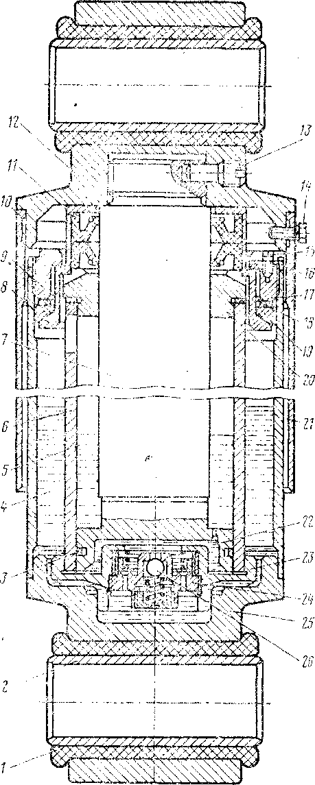 /, 2— р.тулкн; 3— поршневое кольцо; 4—рекуперативная камера; Л — Надпорпшевая полость; 6 — цилиндр; 7 — шток; 8 — обойма; 9 — гайка; 10— защитный кожух; // — сальник; 12 — головка верхняя; 13 — стопорный винт; /'/--болт; 15 — пинт; 16 — стопорная планка; 17 — уплотнительное кольцо; 18 — шайба; 19 — кольцо резиновое; 20 — направляющая букса; 21 — корпус гасителя; 22 — подроршневая полость; 23 — корпус клапана; 24 — клапан; 2Г> — головка нижняя; 26 — предохранительный