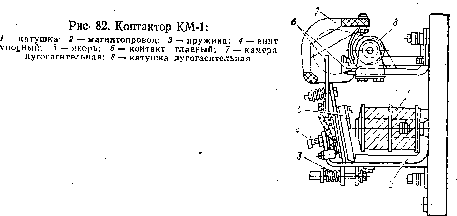 Контакторы этих типов (по схемам К01...4, КРС, КЗ) имеют Г-образный магнитопровод 2 (рис. 82), на сердечнике которого установлена включающая катушка 1. На якоре 5 расположен главный контакта. Контакторы КМ-ЗГ и КМ-ЗД отличаются от контакторов КМ-1 Б