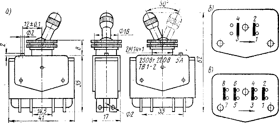 Рис. 95. Переключатели ТВ1-1, ТВ1-2 (а) и схемы их коммутации (б, в)