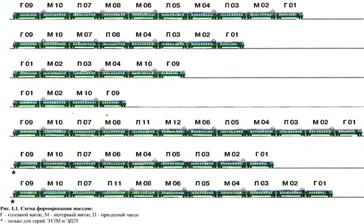 на, а количество моторных вагонов равно половине общего числа вагонов. У электропоездов серий ЭТ2М и ЭД2Т число прицепных вагонов может быть больше числа моторных вагонов.