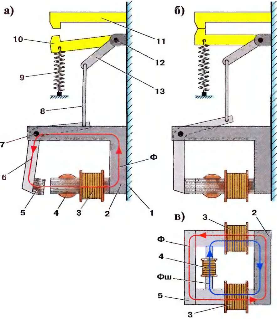 а - контактор выключен; б - контактор включен; в - горизонтальная магнитная цепь магыитопровода; 1 - электроизоляционная стойка; 2 - магнитопровод; 3 - включающвя катушка; 4 - катушка магнитного шунта; 5 - якорь; 6 - рычаг якоря; 7 - ось; 8 - толкатель; 9 - отключающая пружина; 10 - подвижный контакт; 11 - неподвижный контакт; 12 - ось подвижных контактов; 13 - рычаг оси; Ф - магнитный поток включающих катушек; Фш - магнитный поток шунта