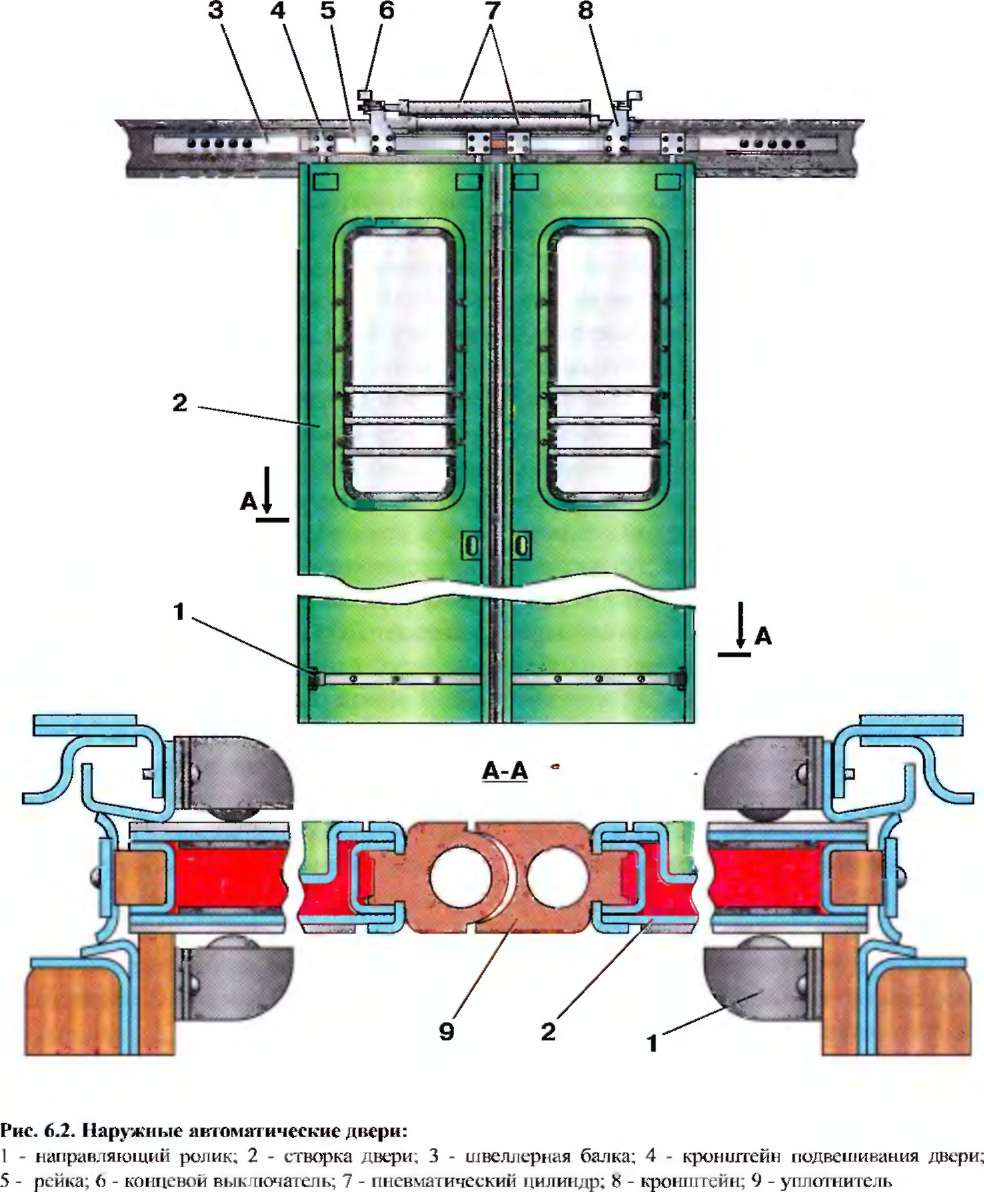 Входные двери имеют электропневматические приводы: над дверями укреплены два дверных цилиндра 7, которые соединены с электропневматическими вентилями. Через вентили подается сжатый воздух в переднюю или заднюю полость цилиндра, в котором установлен поршень со штоком. Штоки поршней соединены с кронштейнами 8, укрепленными на рейках 5, и, перемещаясь вместе с поршнями, открывают или закрывают двери. В нижней части каждой дверной стойки имеются нажимные ролики 1, направляющие створку 2 двери при перемещении. Ролики перекатываются по специальным стальным пластинам, укрепленным на створках.