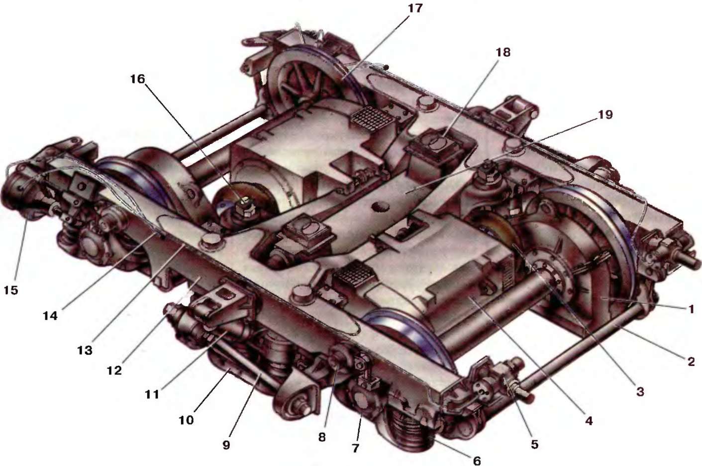 1 - редуктор: 2 - траверса тормозных колодок: 3 - упругая муфта: 4 - тяговый двигатель; 5 - регулятор выхода штока: 6 - пружина; 7 - букса; 8 - фрикционный гаситель колебаний; 9 - поводок; 10 - поддон центрального подвешивания; 11 - гидравлический гаситель колебаний; 12 - рама тележки; 13 - трубка от тормозного цилиндра к регулятору выхода штока; 14 - трубка от магистрали к тормозному цилиндру; 15 - тормозной цилиндр; 16 - узел подвешивания редуктора; 17 - колесная пара; 18 - скользун: 19 - надрессорный брус