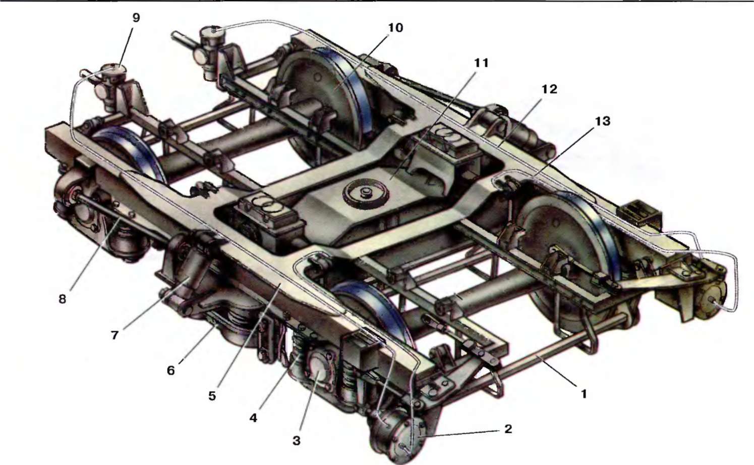 1 - триангель; 2 - тормозной цилиндр; 3 - букса; 4 - пружина; 5 - рама тележки; 6 - центральное подвешивание; 7 - гаситель колебаний; 8 - поводок; 9 - регулятор выхода штока: 10 - колесная пара; 11 - надрессорный брус: 12 - трубка от тормозного цилиндра к регулятору выхода штока; 13 - трубка от магистрали к тормозному цилиндру