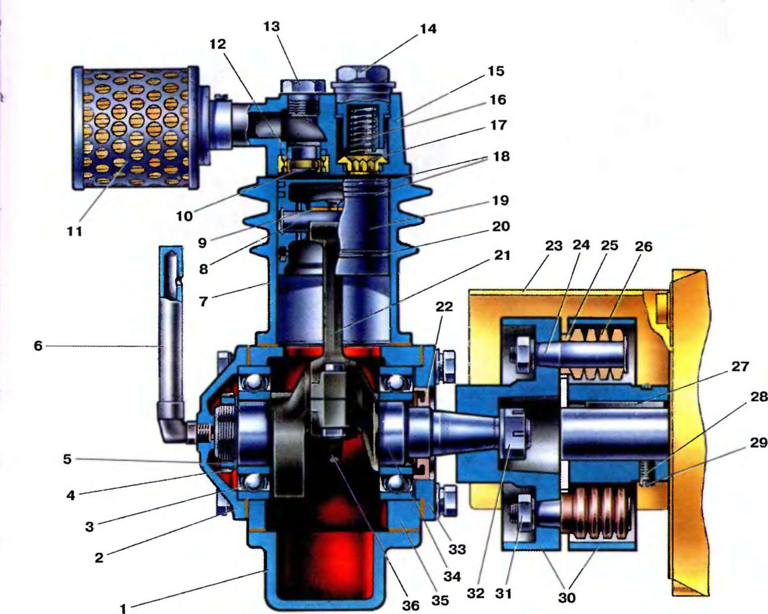 1 - поддон; 2 - крышка заднего подшипника коленчатого вала; 3 - подшипник; 4 - упорная гайка; 5 - замковая шайба; 6 - сапун; 7 - цилиндр; 8 - поршневой палец; 9 - втулка верхней головки шатуна; 10 - всасывающий клапан; 11 - воздушный фильтр; 12, 16 - пружины; 13 - пробка-заглушка; 14 - седло нагнетательного клапана; 15 - головка цилиндра; 17 - нагнетательный клапан; 18 - компрессионные кольца; 19 - поршень; 20 - маслосъемное кольцо; 21 - шатун; 22 - манжета; 23 - кожух муфты; 24 - палец; 25 - распорная втулка; 26 - упругое кольцо; 27 - шпонка; 28 - винт; 29 - стопорное кольцо; 30 - полумуфты; 31. 32 - гайки; 33 - крышка переднего подшипника коленчатого вала; 34 - коленчатый вал; 35 - картер; 36 - разбрызгиватель масла