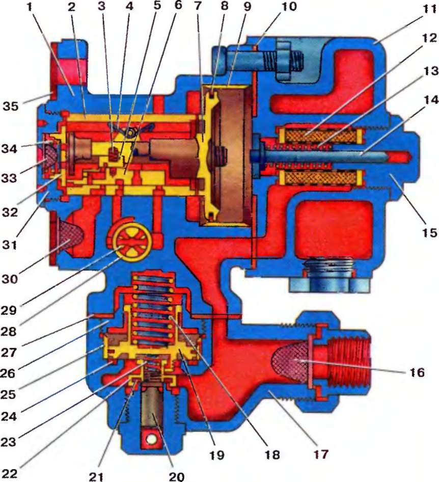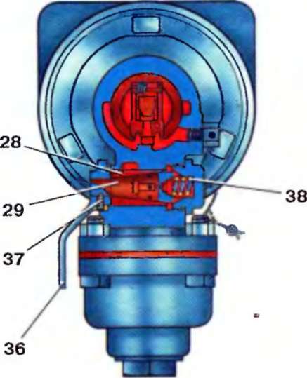 I - корпус воздухораспределителя; 2 - золотниковая втулка; 3, 4. 13. 18. 23, 34. 38 - пружины; 5 - отсскательный золотник; 6 - главный золотник; 7 - магистральный поршень; 8 - уплотнительное кольцо; 9 - втулка магистрального поршня; 10. 27. 35 - прокладки; 11 - крышка воздухораспределителя; 12 - фильтр; 14 - буферный стержень; 15, 31 - заглушки; 16, 30, 33 - сетчатые фильтры; 17 - корпус ускорителя экстренного торможения; 19 - ускорительный поршень; 20 - хвостовик срывного клапана; 21 - уплотнение срывного клапана; 22 - срывной клапан; 24 - уплотнительное кольцо: 25 - втулка ускорительного поршня; 26 - направляющая ускорительного поршня; 28 - втулка переключательной пробки; 29 - переключательная пробка: 32 - буферный стакан; 36 - ручка переключательной пробки; 37 - винт