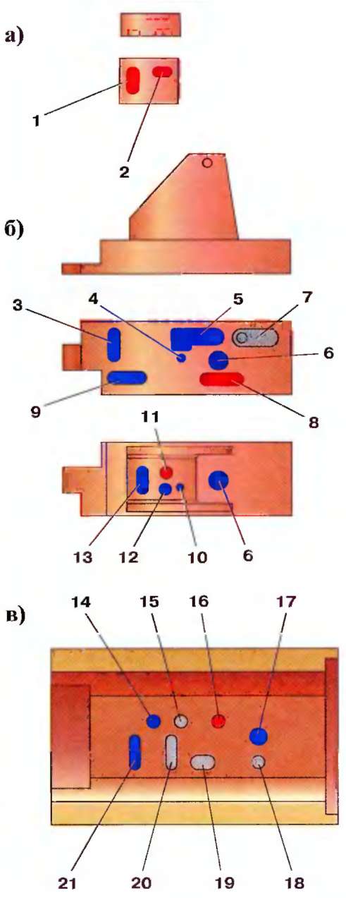 Рис. 7.4. Назначение каналов в золотниках и втулке (см. табл.):