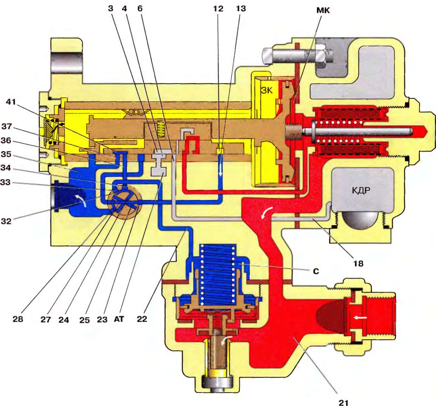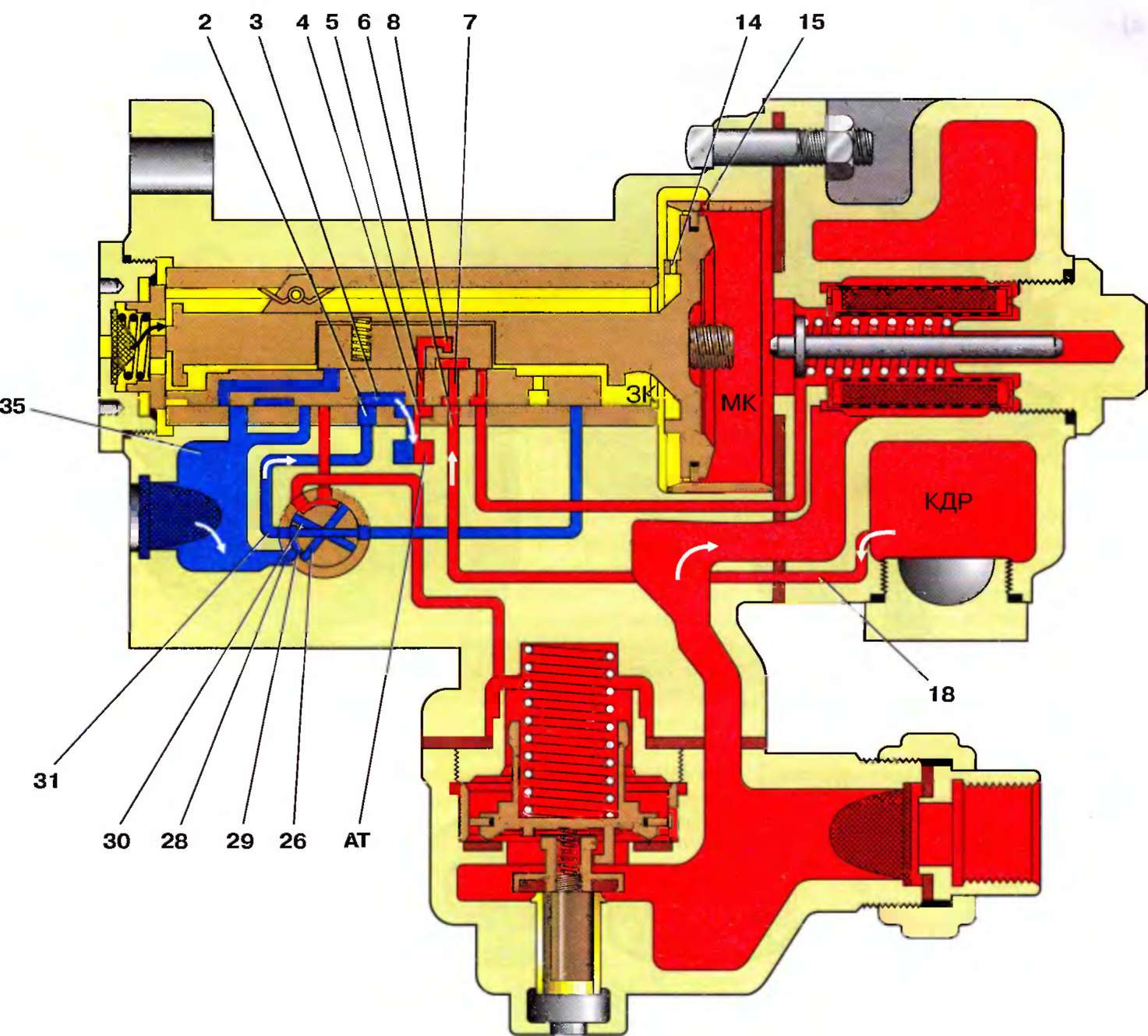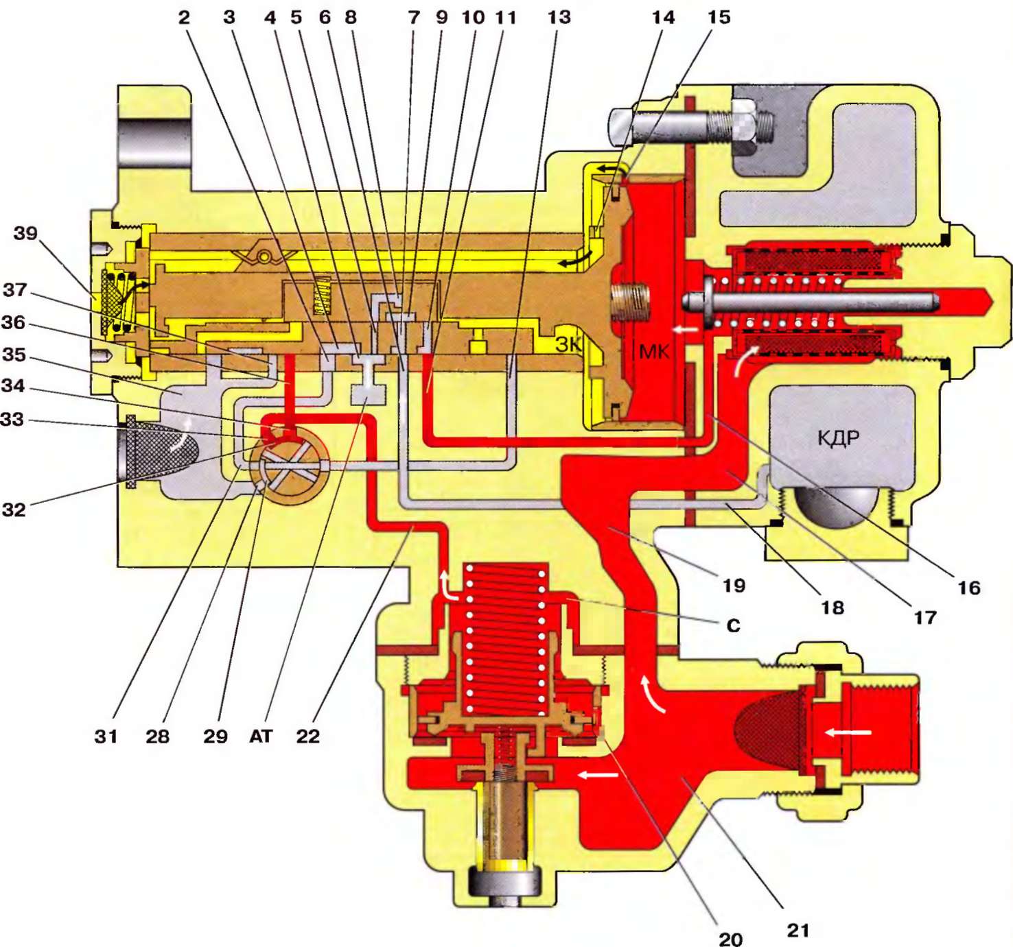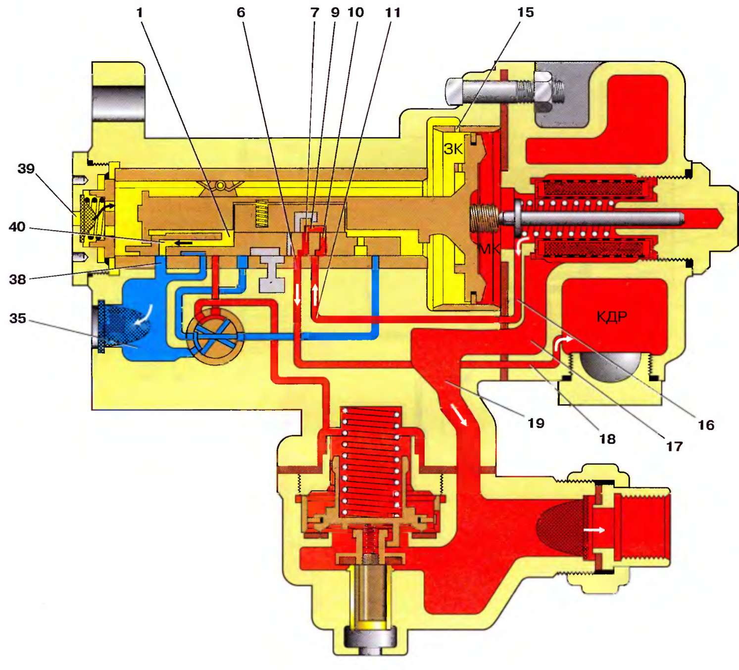 Сжатый воздух из запасного резервуара через отверстие 39, по каналам 1, 40, 38, 35 поступает к реле давления, поэтому давление воздуха на магистральный поршень со стороны камеры ЗК уменьшается, и он останавливается, не сжимая буферную пружину.