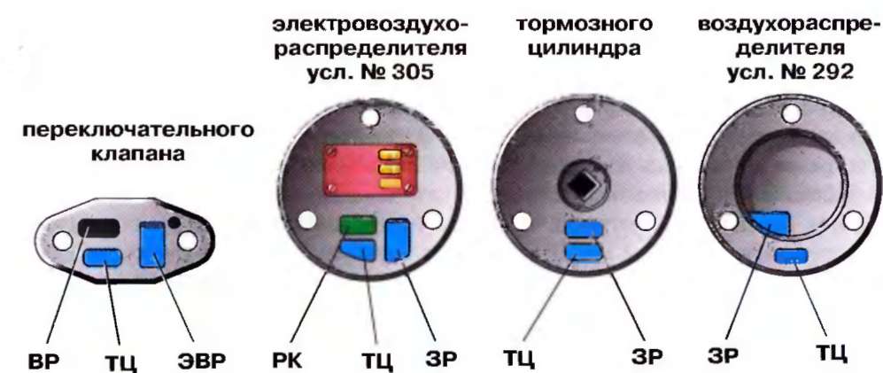 Переключательный клапан 3 предназначен для подключения реле давления и ложного тормозного цилиндра к каналам электровоздухораспределителя или воздухораспределителя в зависимости от того, в каком режиме управляют тормозами - электрическом или пневматическом. Крышки клапана установлены на прокладках 4. Активные площади обоих уплотнений (6 со стороны воздухораспределителя и 5 со стороны электровоздухораспределителя) одинаковы, поэтому клапан из одного положения в другое перемещается при незначительной разнице давлений воздуха на него с той и другой стороны.