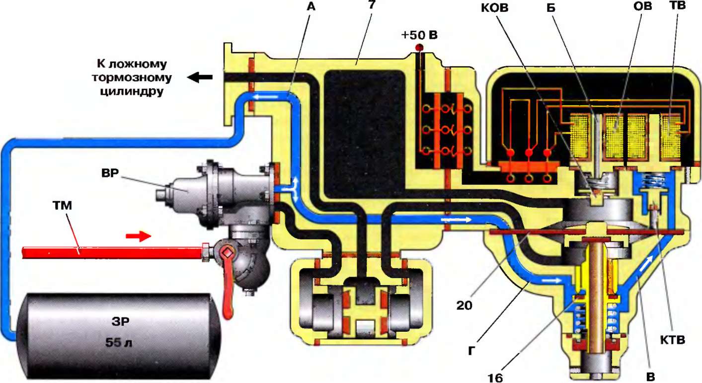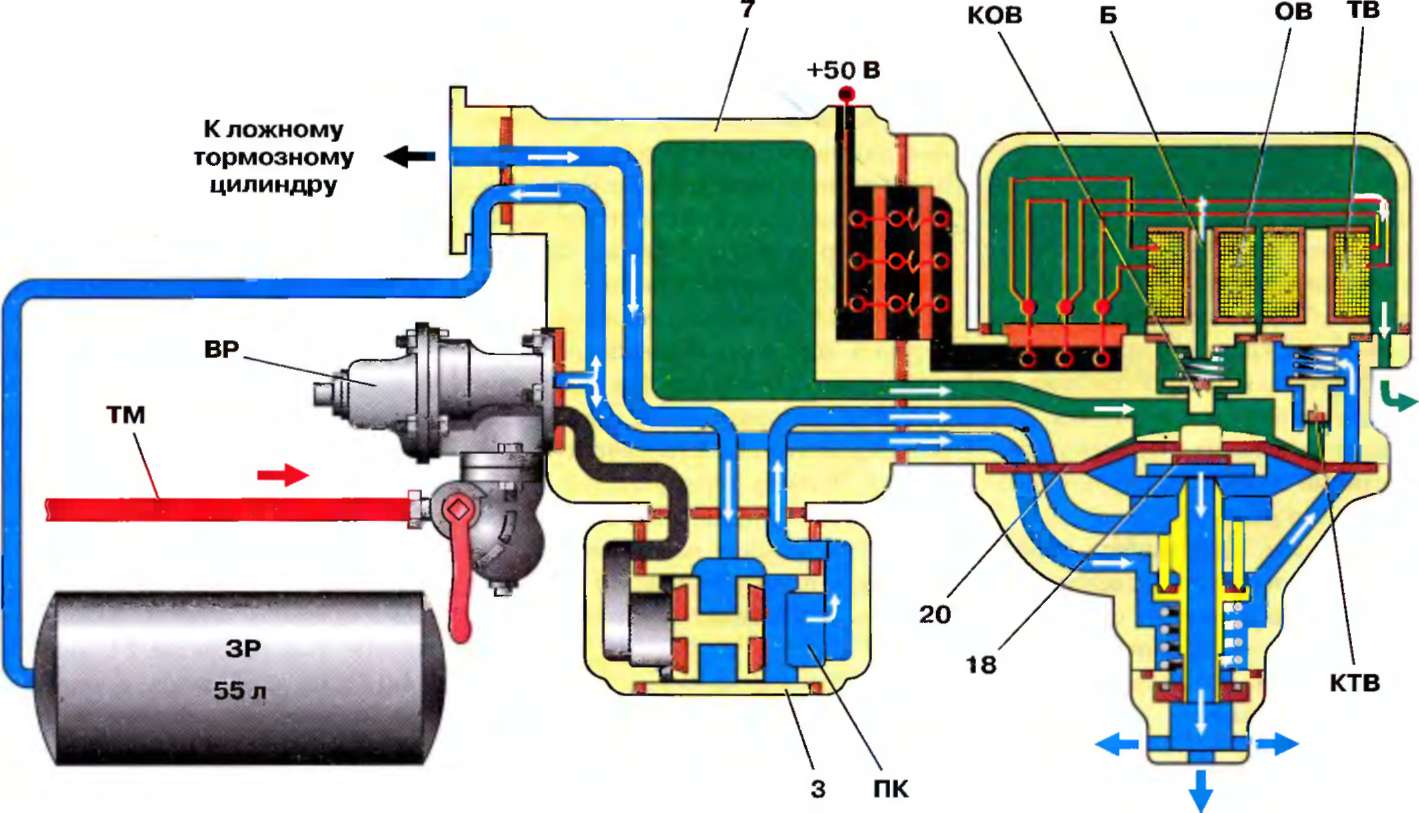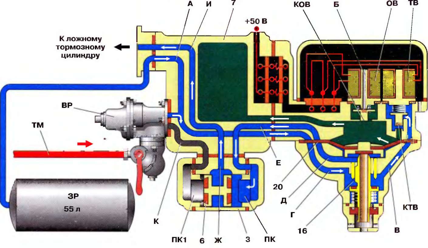 Торможение (рис 7.11). При подаче электропитания катушки вентилей отпускного ОВ и тормозного ТВ возбуждаются, их якоря притягиваются к сердечникам. При этом клапан КОВ закрывается, разобщая полость рабочей камеры 7 с атмосферным каналом Б, а клапан КТВ открывается. Сжатый воздух из запасного резервуара ЗР по каналам А, Г, В и через калиброванное отверстие в седле клапана КТВ проходит в полость над диафрагмой 20 и в камеру 7. Под давлением воздуха диафрагма прогибается вниз, закрывает атмосферный клапан 18 и открывает питательный клапан 16 пневматического реле. Воздух из запасного резервуара по каналам А и Г, через полость под диафрагмой 20, по каналам Д и Е, через полость ПК поступает к переключательному клапану 3, перемещает его влево до упора уплотнения 6 в седло и направляется по каналам Ж, И в ложный