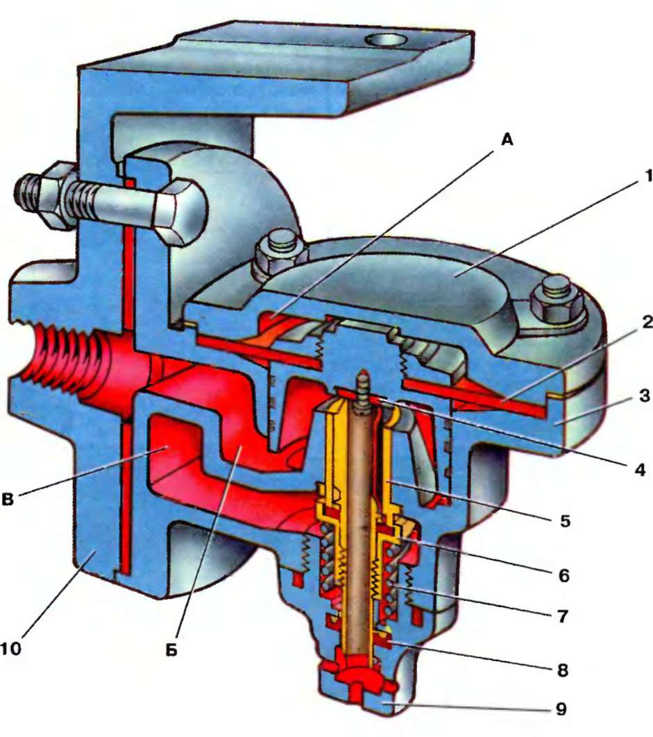 А - возбудительная камера; Б - тормозная камера; В - питательная камера: 1 - крышка; 2 - диафрагма; 3 - корпус; 4 - выпускной клапан; 5 - седло питательного клапана; 6 - питательный клапан; 7 - пружина; 8 - манжета; 9 - заглушка; 10 - кронштейн